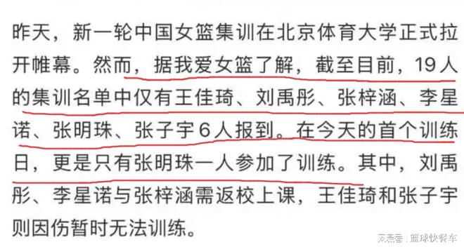 而更为尴尬的是,即便只有6人前往国家队报道。可这6名球员,能够参加第一天集训的却只有可怜的1人。由于伤病困扰,张子宇和王佳琦暂时无法参加训练。而刘禹彤、李星诺以及张梓涵,他们三人则因为学业问题,不得不暂时返校。这样一来,国家队集训第一天,也就只剩下张明珠一人。从集训19人大名单,到只有6人前往报道,再到最后只有1人参加集训,这看上去似乎有点凄凉。