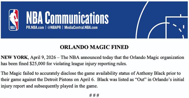 北京时间4月10日,NBA在今日官方声明中宣布,奥兰多魔术队因违反联盟伤病报告规定,被罚款25000美元。