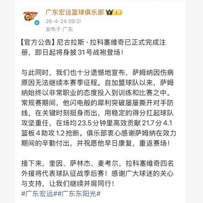 根据CBA联赛的规则,本赛季,外援最后的注册时间,将会在4月24日截止!在今天,广东队终于是做出了最后的一个决定,没错,那就是确定了季后赛四名外援。