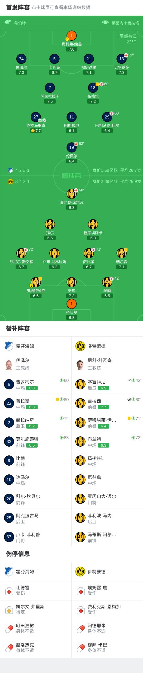 第42分钟,克拉马里奇造点并亲自操刀命中,霍芬海姆1-0多特